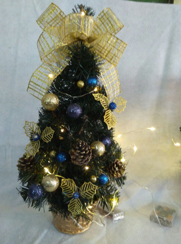 圣诞绿色迷你树+金球/闪光松果/红花/红带