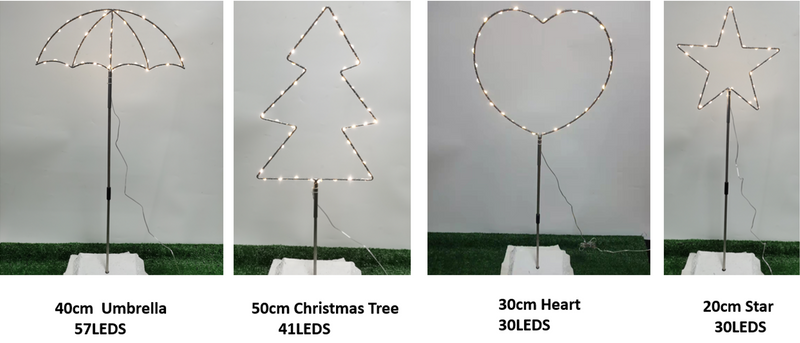 铁架造型灯(插地灯)、太阳能或低压装饰灯。