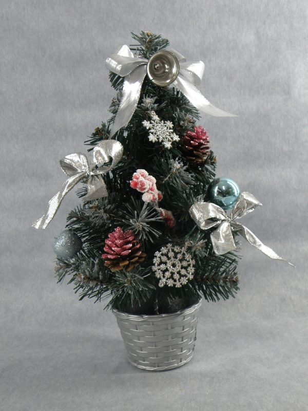 圣诞绿色迷你树+闪光球/彩色松果/雪花/银带