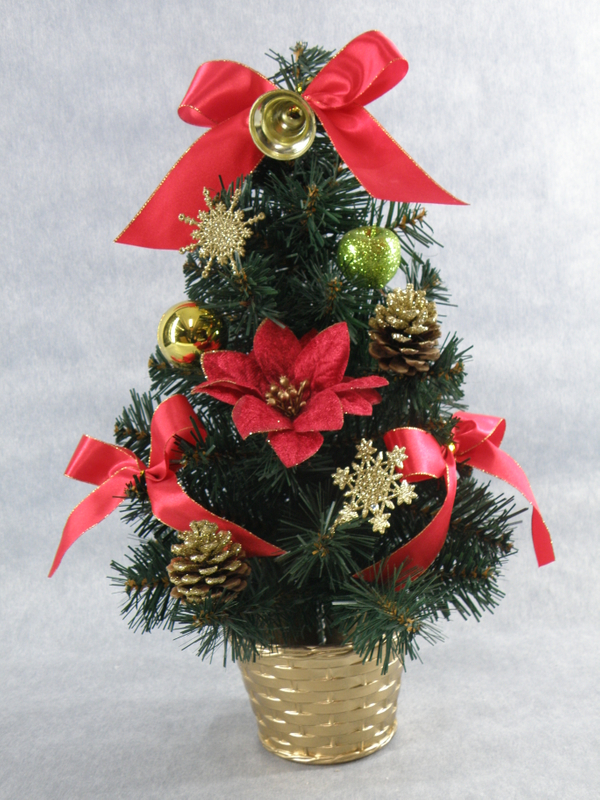 圣诞绿色迷你树+金球/闪光松果/红花/红带