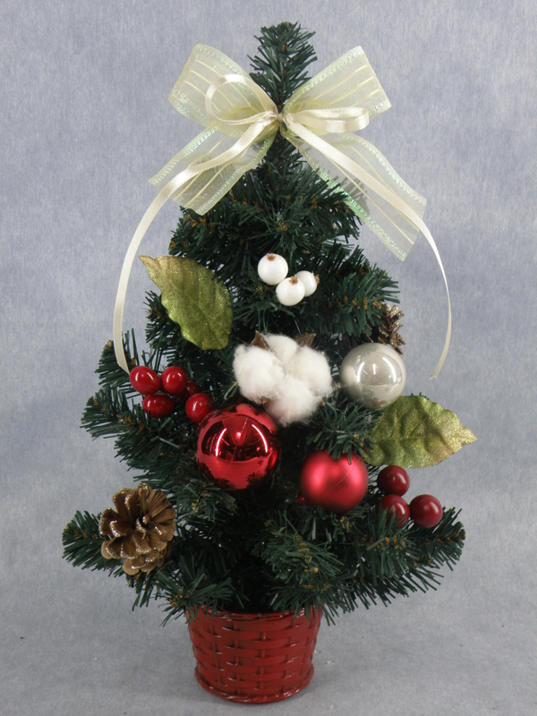 圣诞绿色迷你树 +金球/闪光的松果/红色花朵/红色丝带